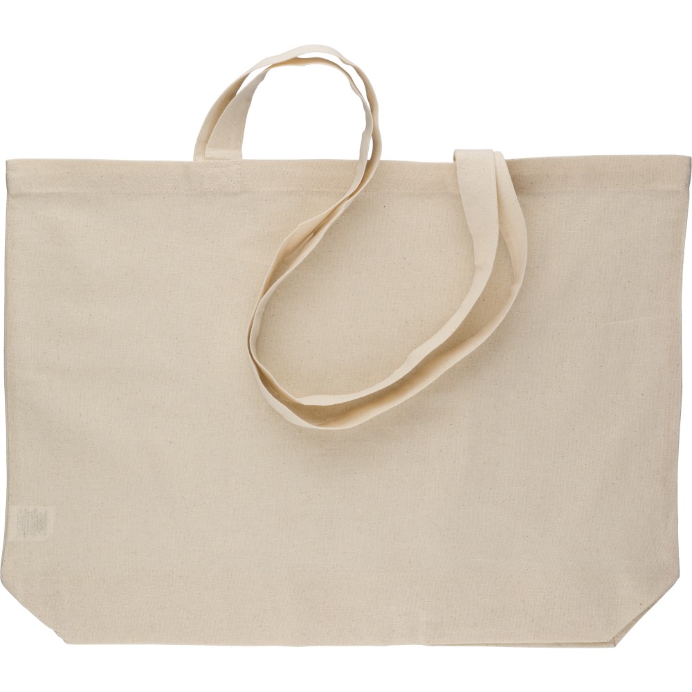Oeko-Tex minősítésű, 140 g/m2 pamutból készült natúr színű bevásárlótáska, 48 × 34 × 10 cm méretben, 70 cm hosszúságú és 2,5 cm szélességű fülekkel. Oeko-Tex címkével ellátva.