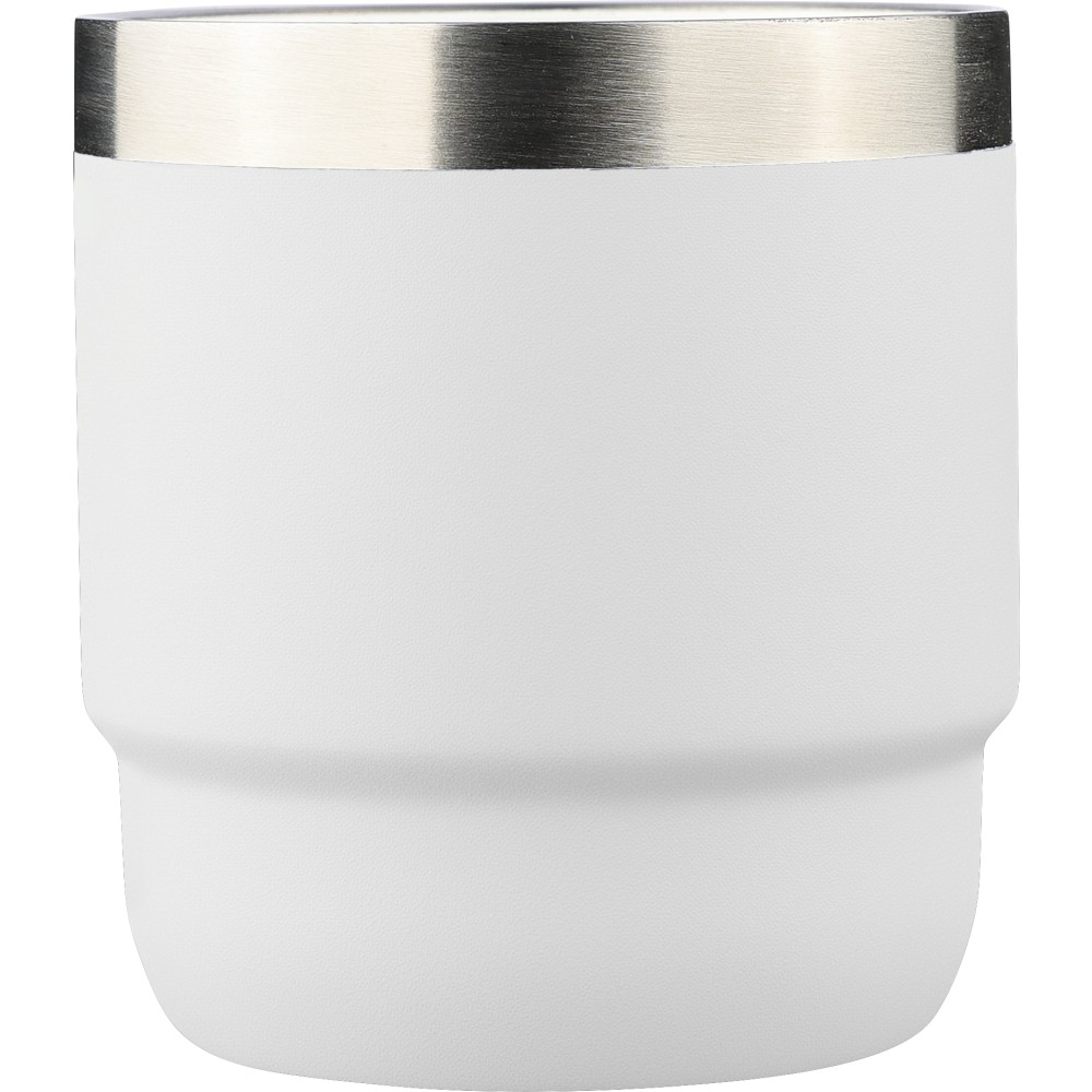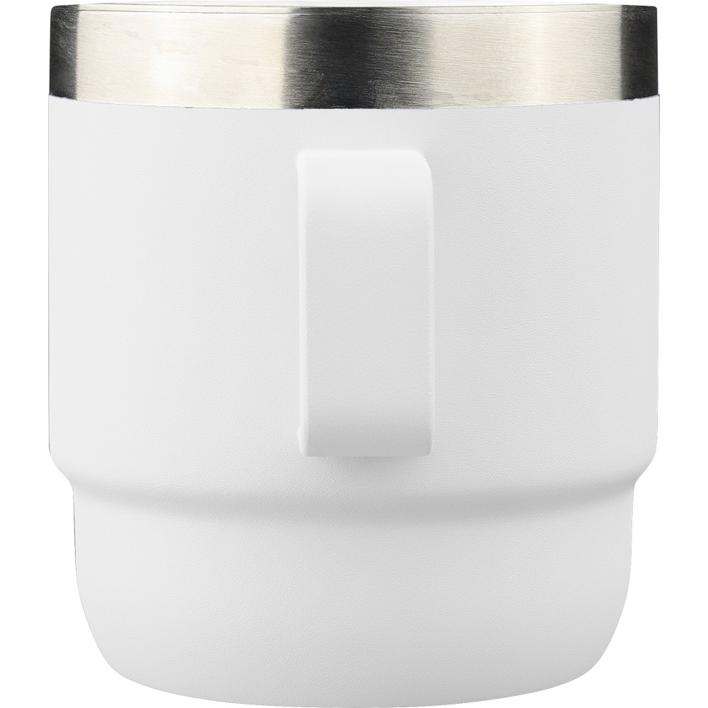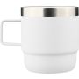 Újrahasznosított rozsdamentes acélból készült bögre (180 ml) duplafalú kialakítással, kerámia belső bevonattal és fogantyúval, a csészén lézergravírozott recycled (újrahasznosított) rozsdamentes acél alapanyagra utaló logó található, darabonként barna kartondobozba csomagolva.