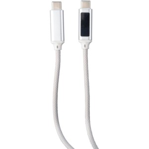 Töltőkábel alumínium csatlakozókkal. Hossza: 1 méter. USB-C-ről USB-C-re. Teljesítmény: 100 W. Kék töltési sebességet jelző lámpa az egyik aljzaton. Barna kartondobozba egyedileg csomagolva. Adatátviteli sebesség 480 Mbps. Emblémázás: Gravírozás