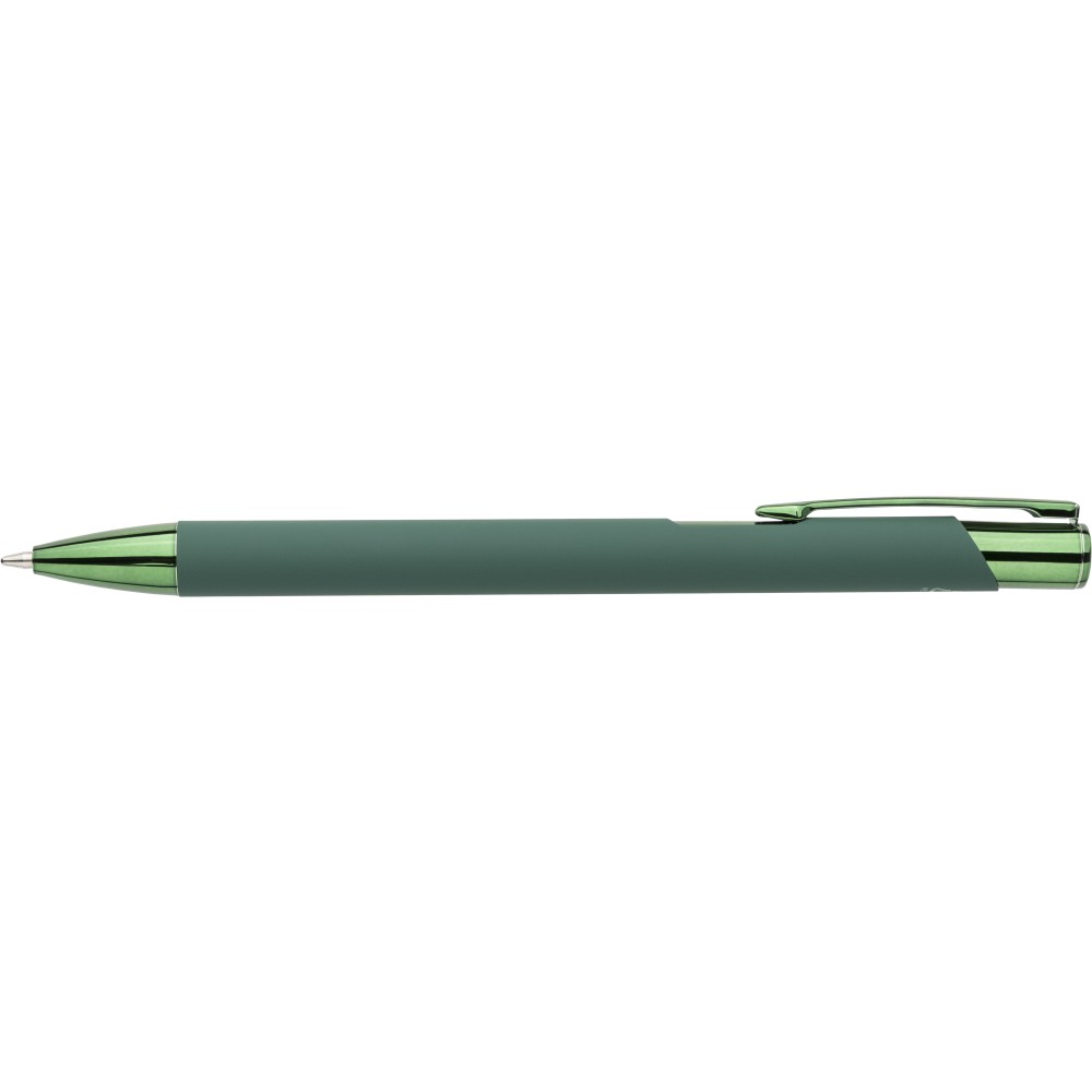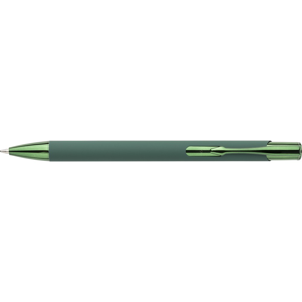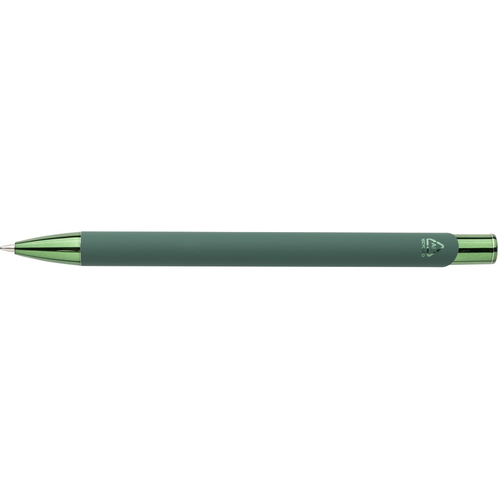 Újrahasznosított alumíniumból készült, gumírozott felületű golyóstoll, a toll színével harmonizáló UV-bevonatú műanyag és fém díszítéssel. Gravírozás után fényes tükörhatás jelenik meg. A tolltesten gravírozott recycled (újrahasznosított) alapanyagra utaló logó található. Megközelítőleg 800 méter íráshosszúságú, kék színű tollbetéttel.