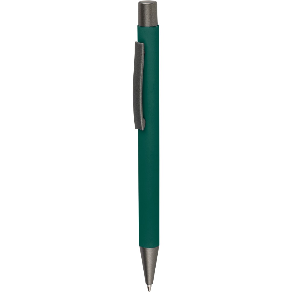 Újrahasznosított alumínium golyóstoll lágy tapintású gumírozott felülettel és kék tollbetéttel. Sötétszürke kiegészítőkkel és a bevonat alatti tükörhatású réteggel tervezve a látványos gravírozási eredmény érdekében. Nyomógombos szerkezettel és gravírozott újrahasznosított logóval.