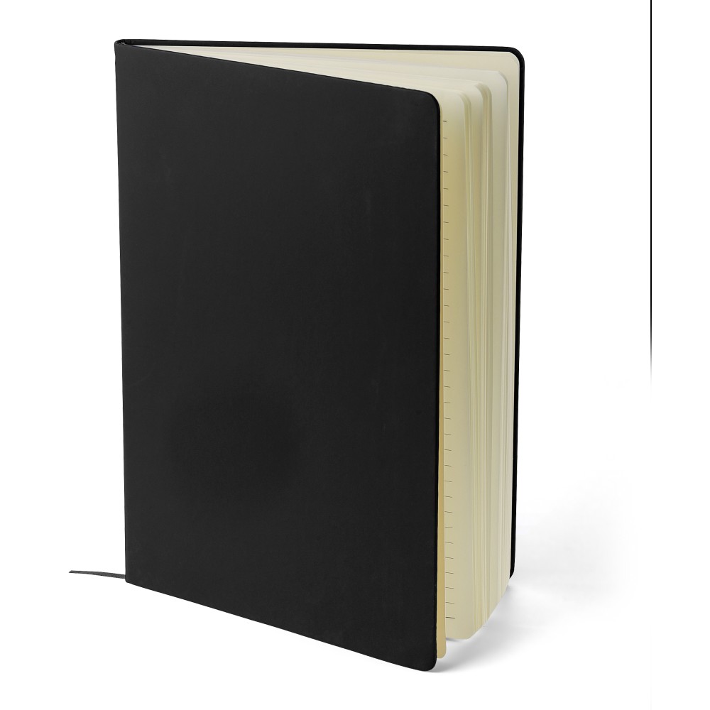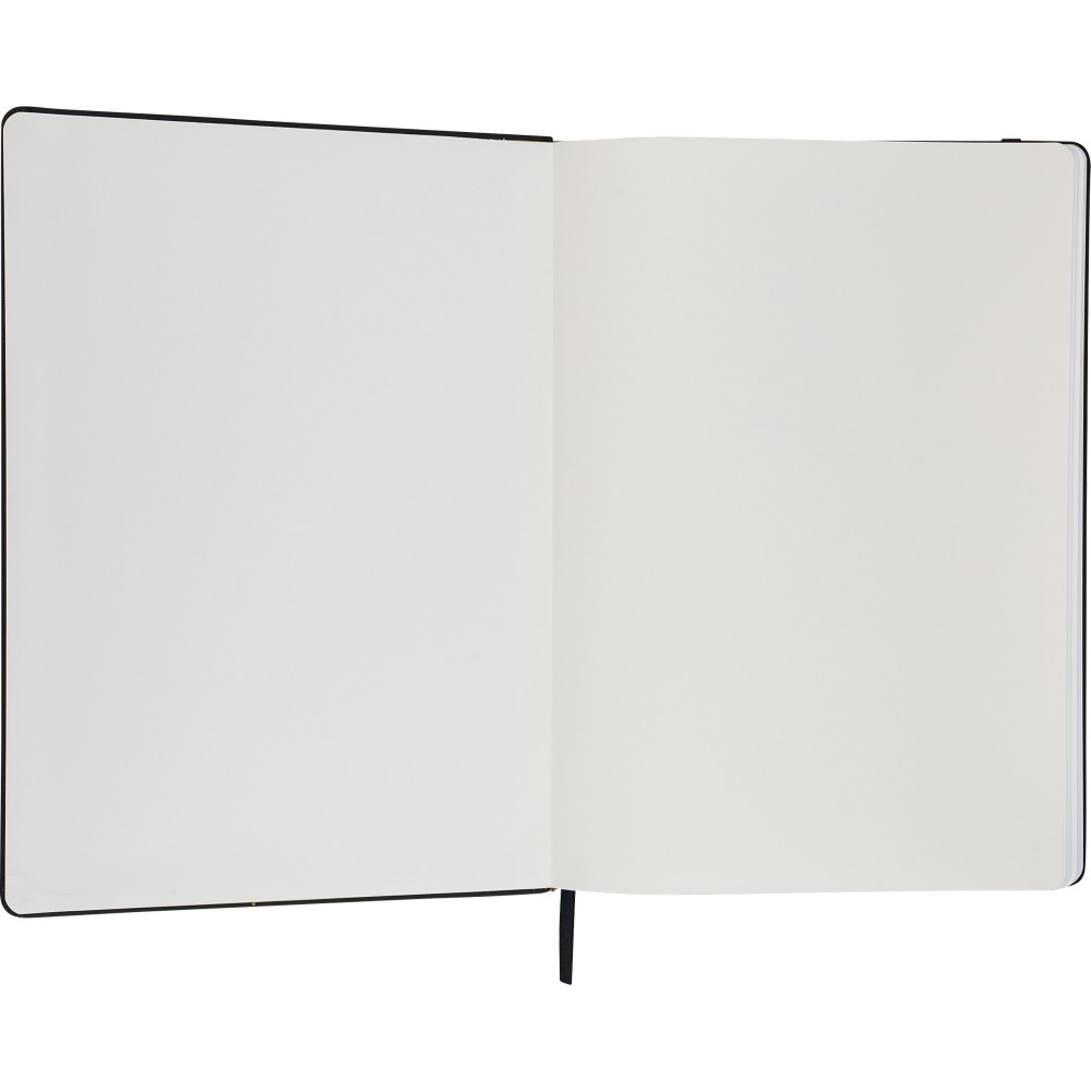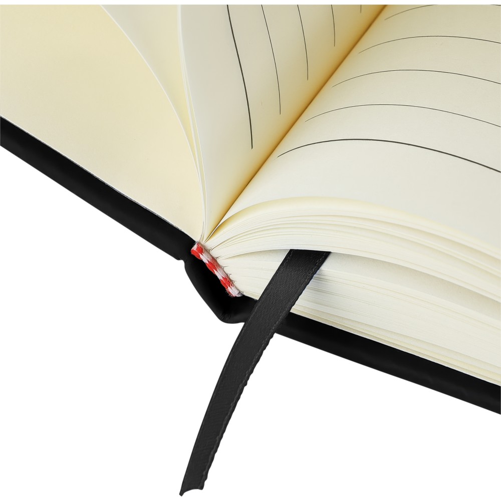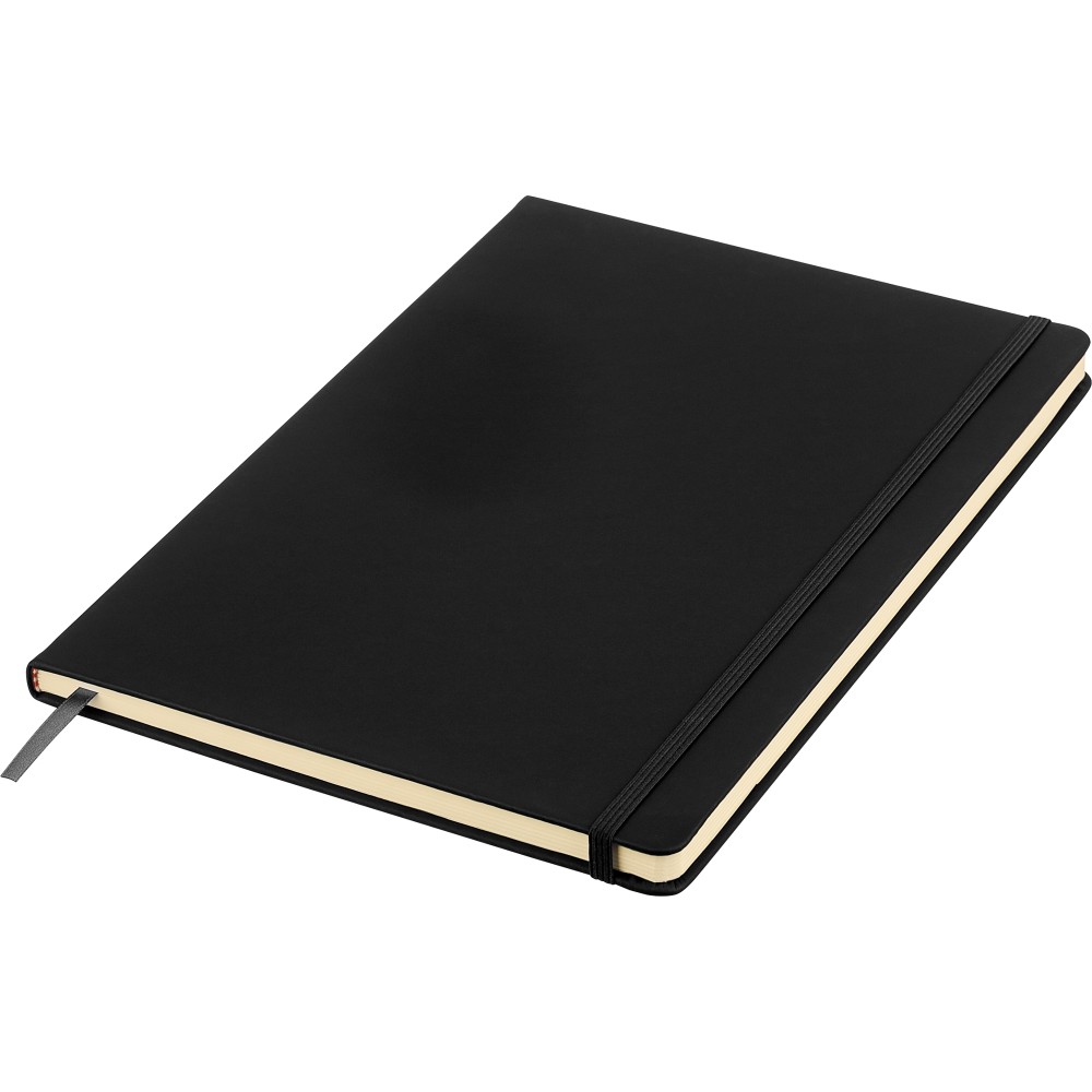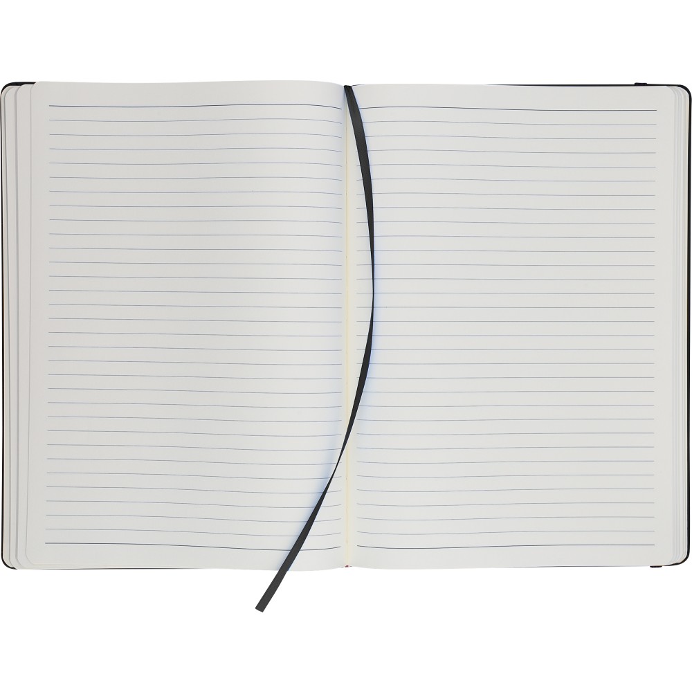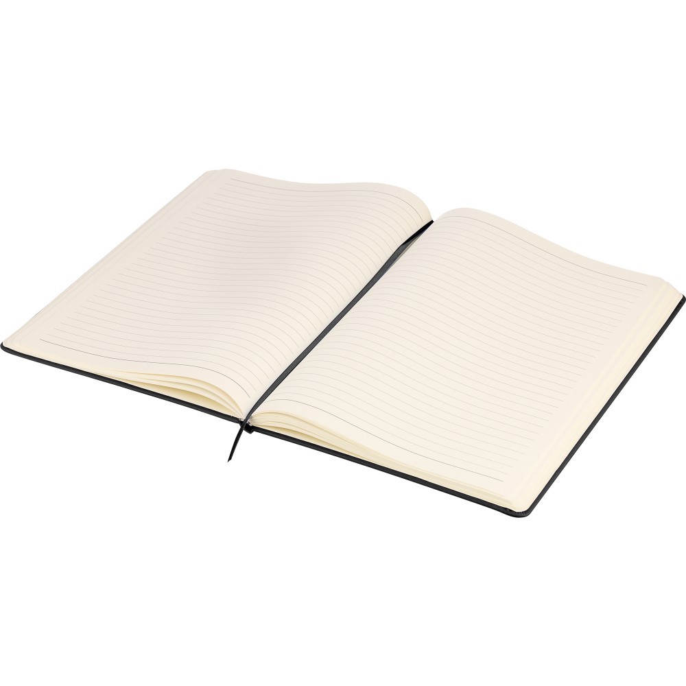A4-es jegyzetfüzet élénk színű, újrahasznosított anyagból (PU) készült kemény borítóval. 96 db kétoldalas, vonalas lapot tartalmaz (6 g/m2), 0,7 cm-es vonalközzel, az elején és a végén két-két üres oldallal. A füzetben használt papír FSC Mix tanúsítvánnyal rendelkezik. Színben illeszkedő gumírozott rögzítőpánttal, beépített könyvjelző szalaggal és a hátoldalán dombornyomott újrahasznosított PU logóval ellátva.