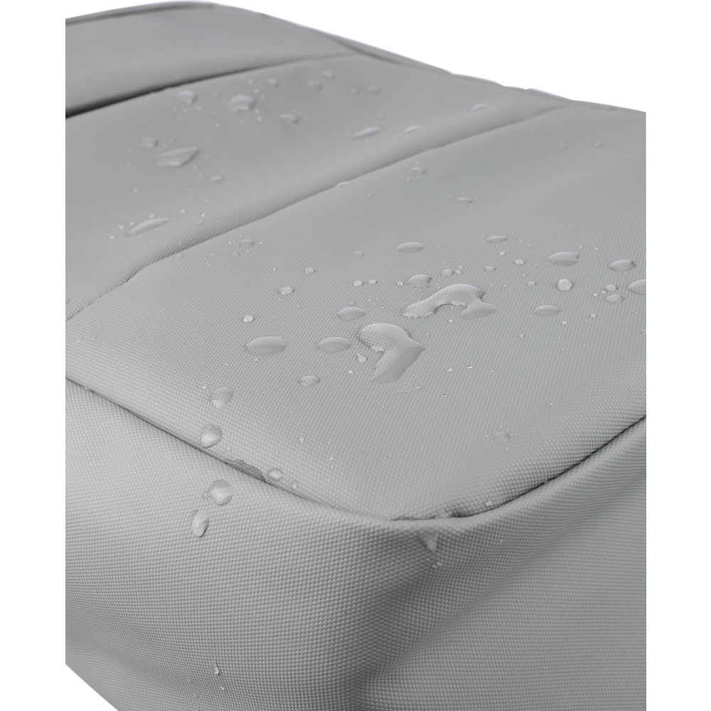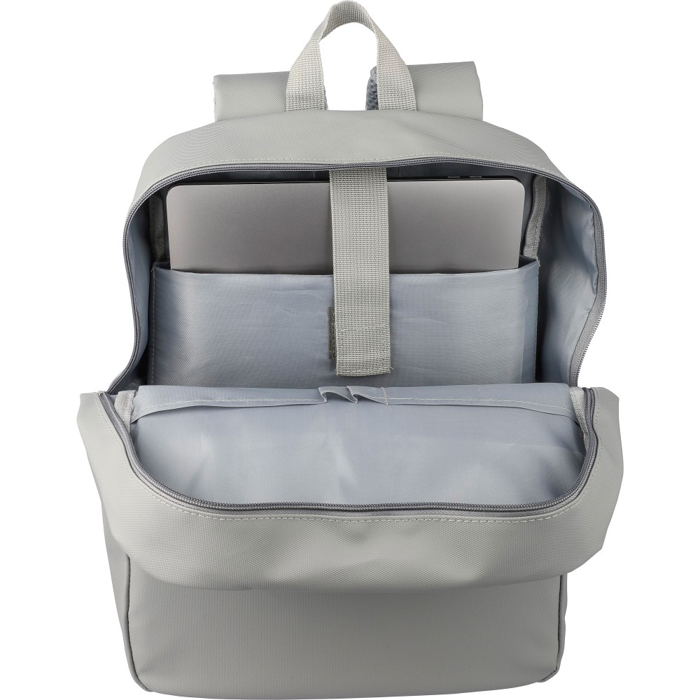 Laptop hátizsák 15 -es készülékhez. Két cipzáras elülső zsebbel, egy nagy cipzáras rekesszel és tépőzáras laptoprésszel, valamint több belső zsebbel. Szellőző, párnázott hátoldallal, trolifogantyúval és állítható vállpántokkal. Vízlepergető. Anyaga: PU. Emblémázás: Szitanyomás