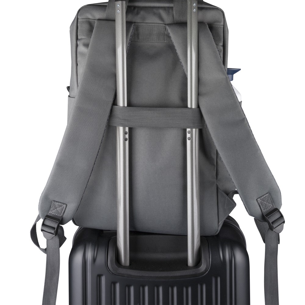 Újrahasznosított 900D poliészterből készült hátizsák, 210D béléssel és rPET címkével. Tágas fő rekesszel rendelkezik, 16?-os laptop számára kialakított külön zsebbel, elülső rekesszel, két oldalzsebbel, valamint bőröndre rögzíthető pánttal (trolley strap). Felső fogantyúi gombbal összefoghatóak, vállpántjai szellőző kialakításúak a kényelmes viselet érdekében.
