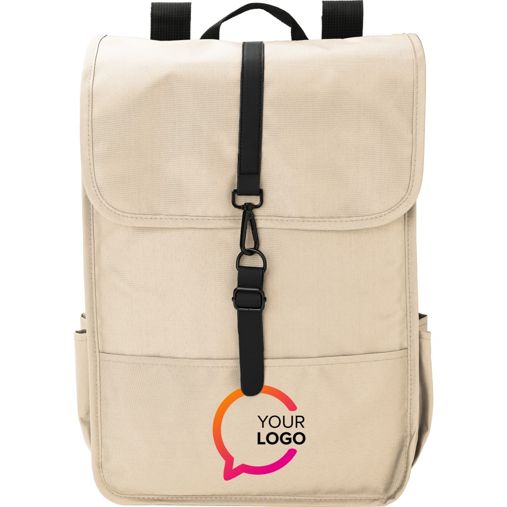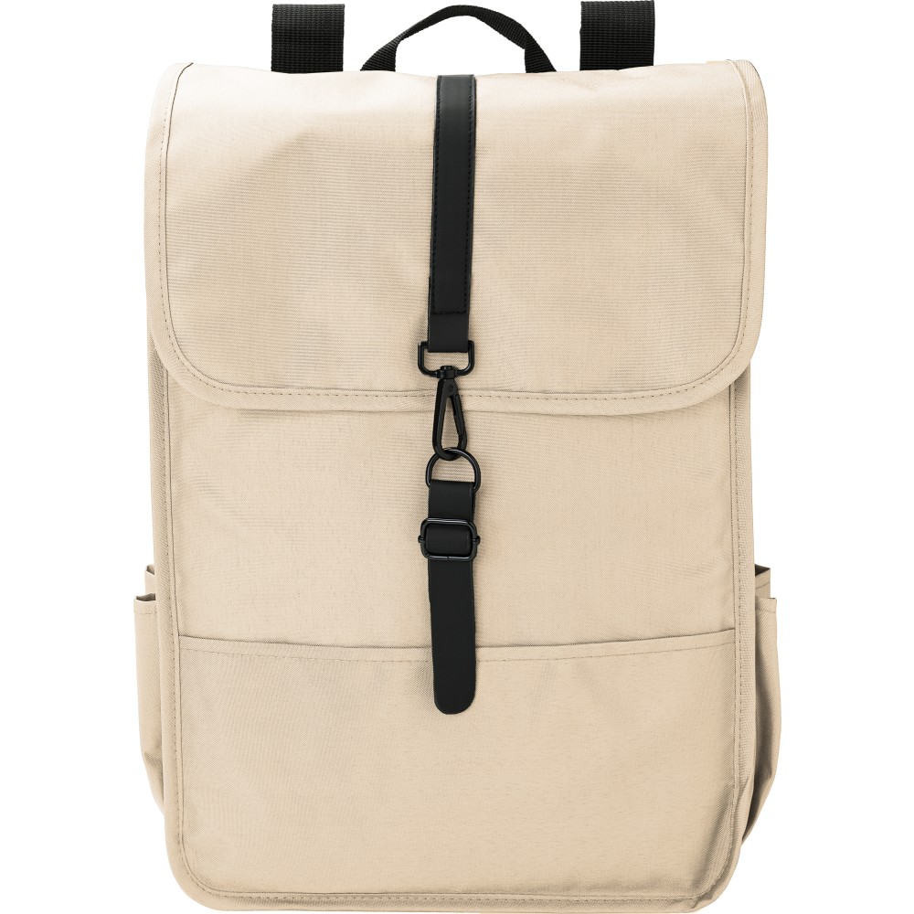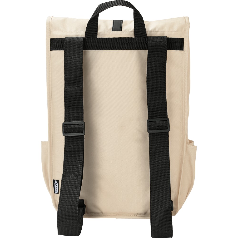 Hátizsák. Két palackzseb az oldalán, egy nagy rekesz. Fekete PU pánttal, csattal zárható. 300D RPET poliészter. Emblémázás: Szitanyomás