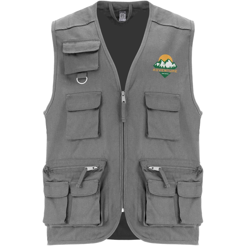 V-nyakú, többfunkciós zsebekkel ellátott munkamellény. Elülső cipzárja húzókával felszerelt. A mellrészen három zseb található, amelyek hajtókával és tépőzárral záródnak, a felső zseb pedig multifunkciós gyűrűvel kiegészített. Két cipzáras és húzókával ellátott oldalsó zsebbel rendelkezik, amelyeken két további, hajtókás és tépőzáras zseb helyezkedik el. A hátoldalon két hajtókás, tépőzáras zseb található. A nyakkivágás, a karkivágások és az derékrész díszítőszegéllyel van ellátva.