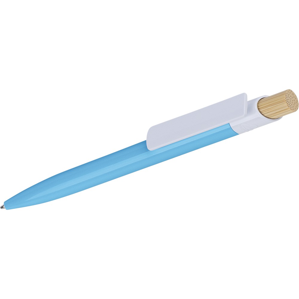 Újrahasznosított ABS-ből készült golyóstoll bambusz nyomógombbal és fehér klippel, digitális nyomtatásra alkalmas kivitelben. A tolltesten fröccsöntés során elhelyezett recycled (újrahasznosított) alapanyagra utaló logó található. Megközelítőleg 600 méter íráshosszúságú, kék színű tollbetéttel.