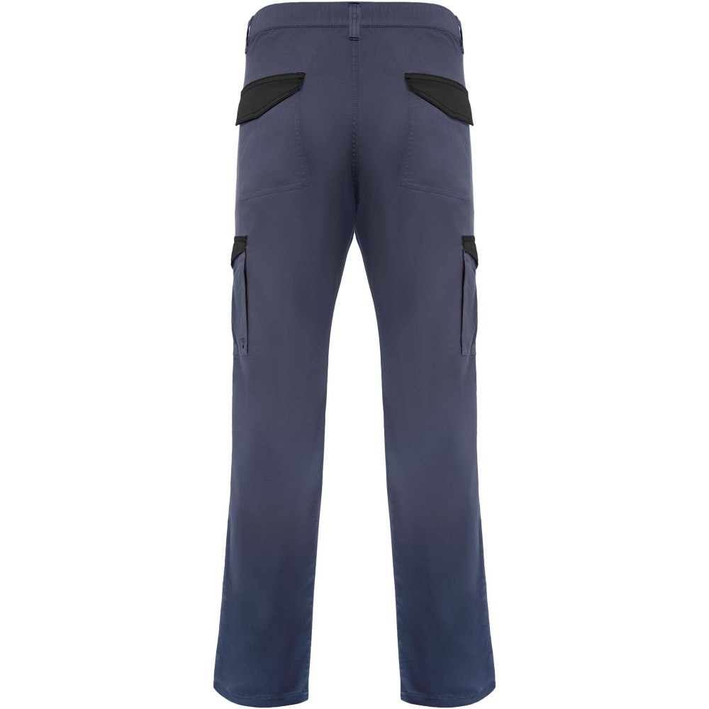 Hosszú szárú munkásnadrág, amely kényelmes és strapabíró anyagból készült. A nadrág hátul gumírozott derékkal rendelkezik az állíthatóság érdekében. Kontrasztos színű övbújtatókkal, zsebfedőkkel, hajtásokkal és szegélyekkel díszített. A praktikus kialakítást két elülső zseb, két tépőzáras fedéllel ellátott, hajtogatott oldalsó zseb, valamint két szintén tépőzáras fedéllel záródó hátsó zseb biztosítja.