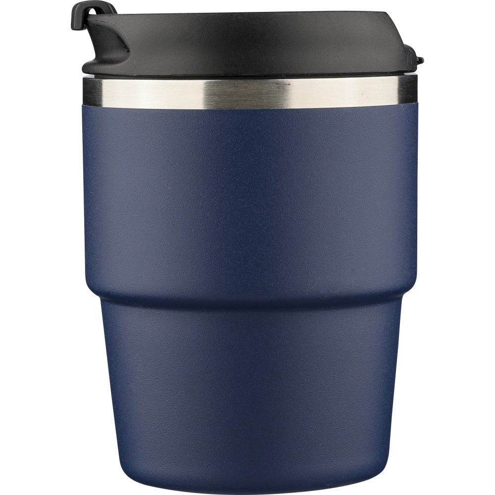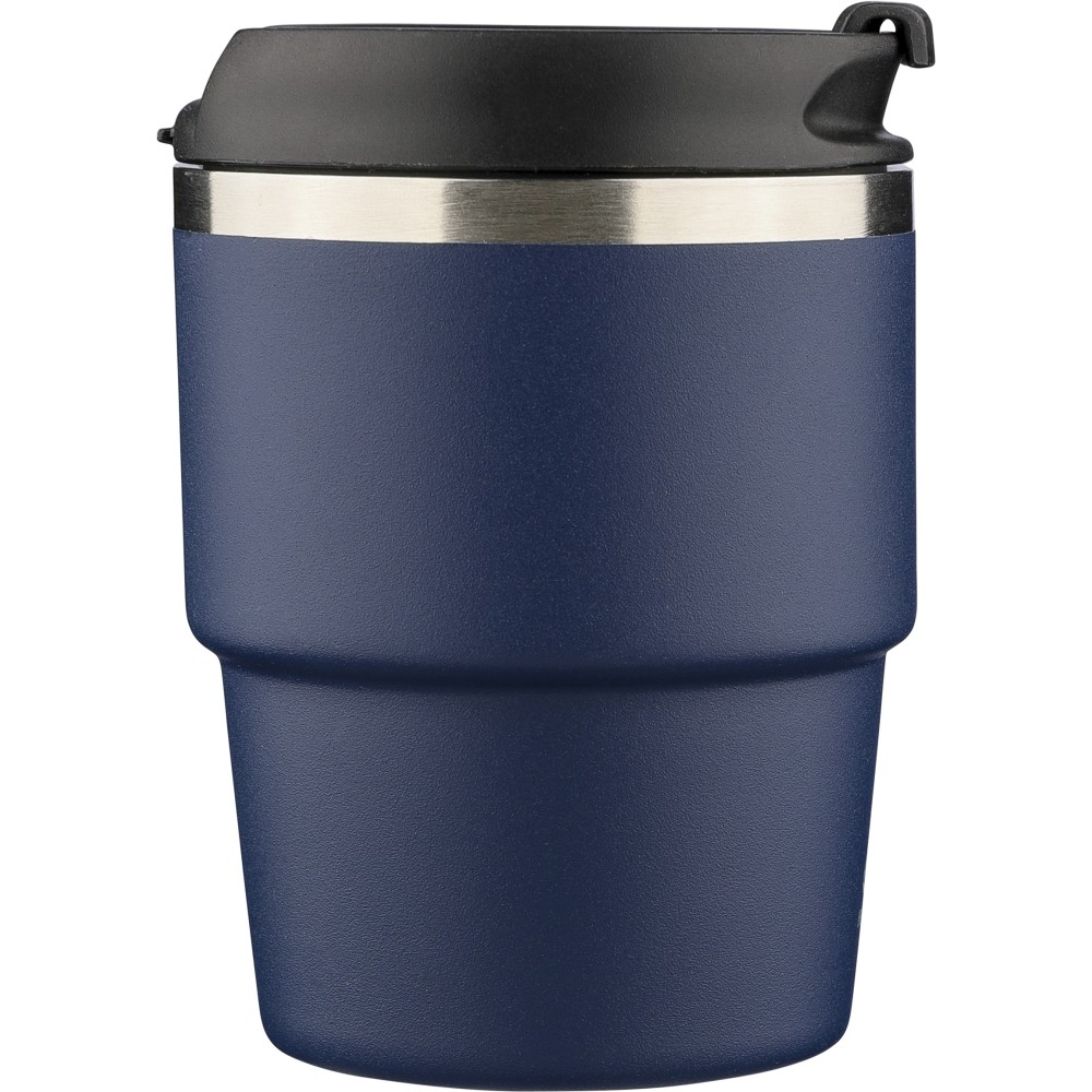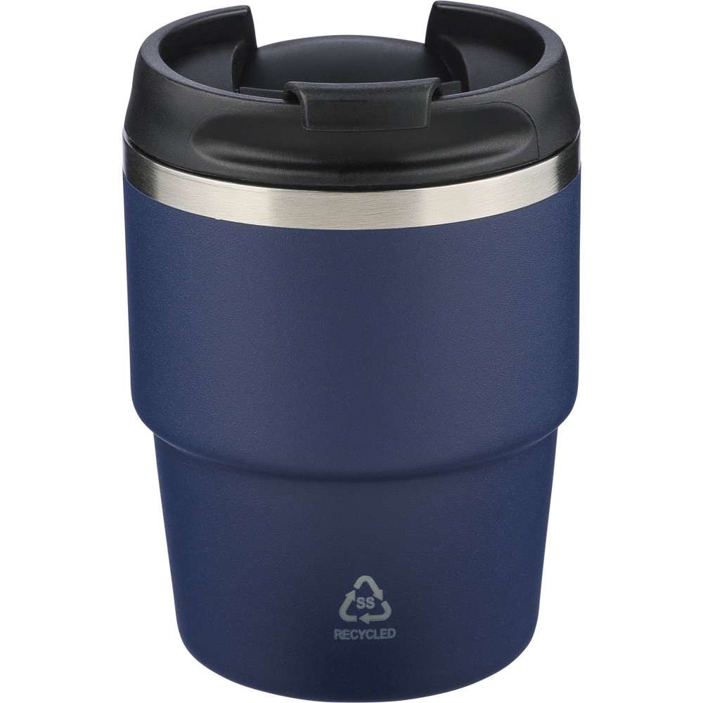 Újrahasznosított rozsdamentes acélból készült, vákuumszigetelésű bögre (175 ml) duplafalú kialakítással és porfestett felülettel, PP csavaros fedéllel. A pohártesten lézergravírozott recycled (újrahasznosított) alapanyagra utaló logó található. Kompakt kialakítása miatt a legtöbb kávégépbe illeszkedik, darabonként barna kartondobozba csomagolva szállítjuk.