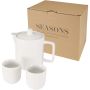 Kétszemélyes, kerámia teáskészlet két hozzáillő csészével, amely ideális választás közös teázáshoz vagy reprezentatív ajándéknak. A tartós kerámiából készült szett mindennapi használatra és különleges alkalmakra egyaránt alkalmas, elegáns megjelenése mellett pedig könnyű kiöntést biztosít. A termék mosogatógépben tisztítható. A teáskanna űrtartalma 600 ml, a csészéké pedig 90 ml.