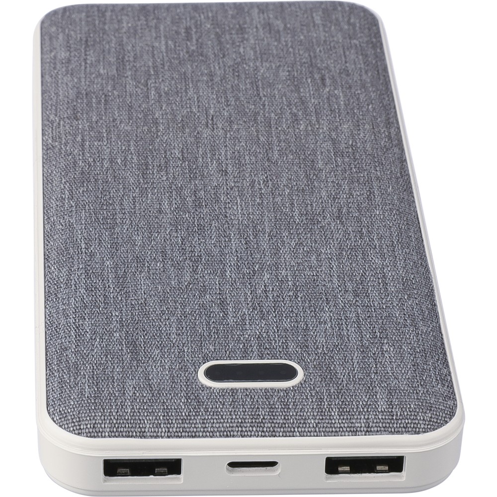 Újrahasznosított ABS és rPET anyagból készült powerbank 10.000 mAh kapacitással, dual USB és USB-C porttal (5V/2.4A), töltéskijelzővel, tetején rPET logóval. 30 cm-es kábel tartozik hozzá. Csomagolása kraftpapír doboz. Emblémázás: Tamponnyomás