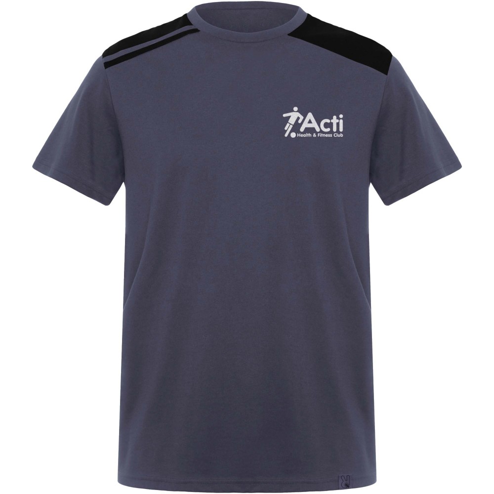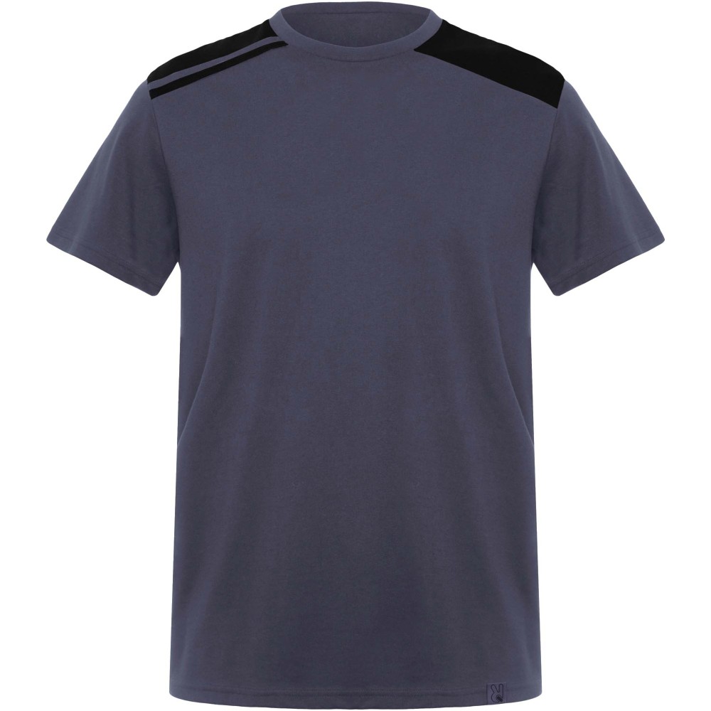 Rövid ujjú, kombinált színvilágú póló, amely kontrasztos vállrészekkel és díszítőelemekkel rendelkezik. A kerek nyakkivágást kontrasztos színű, fedett belső varrásokkal látták el, az esztétikus kialakítást pedig az oldalvarrások teszik teljessé.