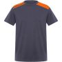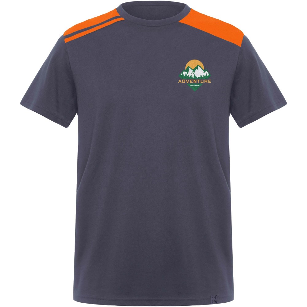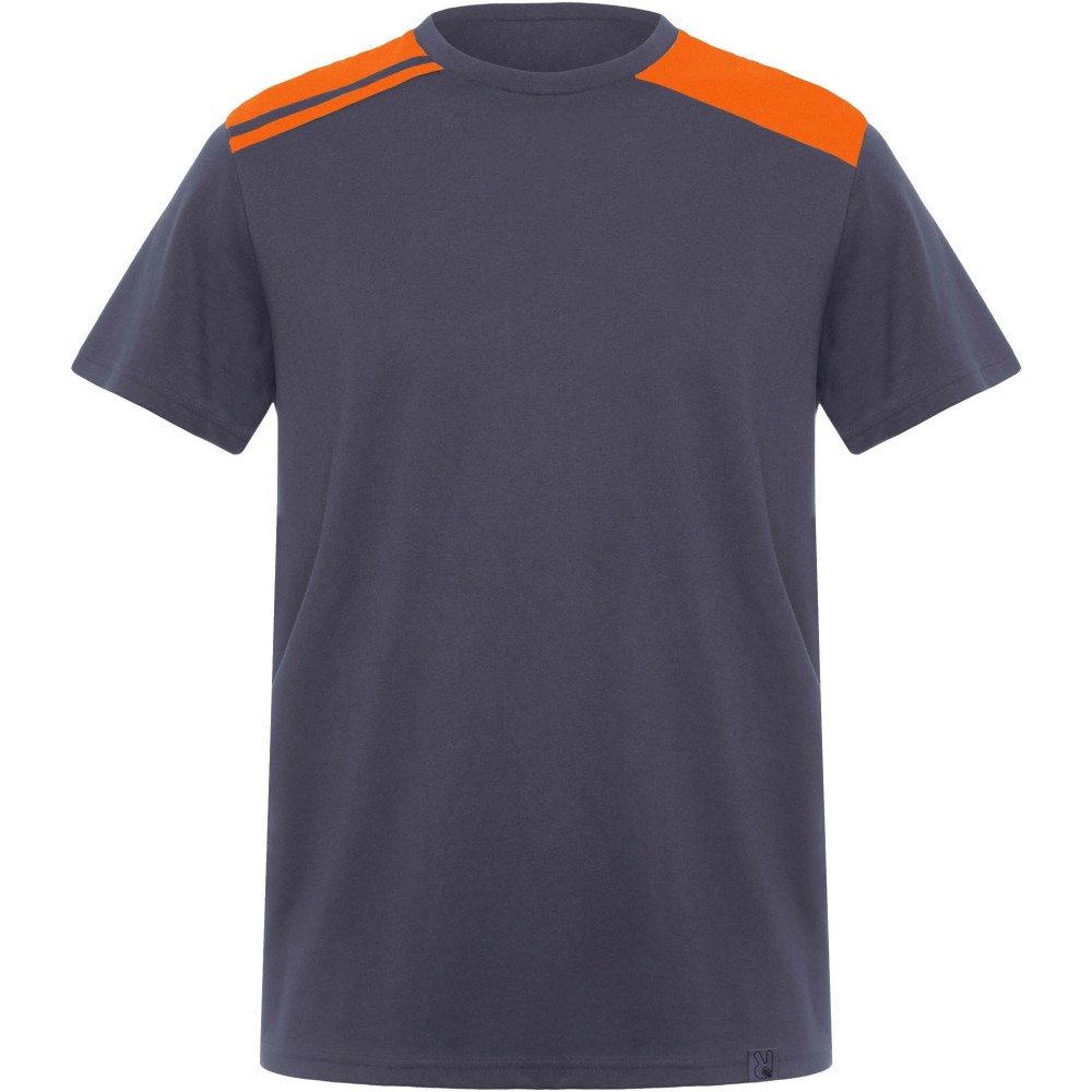 Rövid ujjú, kombinált színvilágú póló, amely kontrasztos vállrészekkel és díszítőelemekkel rendelkezik. A kerek nyakkivágást kontrasztos színű, fedett belső varrásokkal látták el, az esztétikus kialakítást pedig az oldalvarrások teszik teljessé.