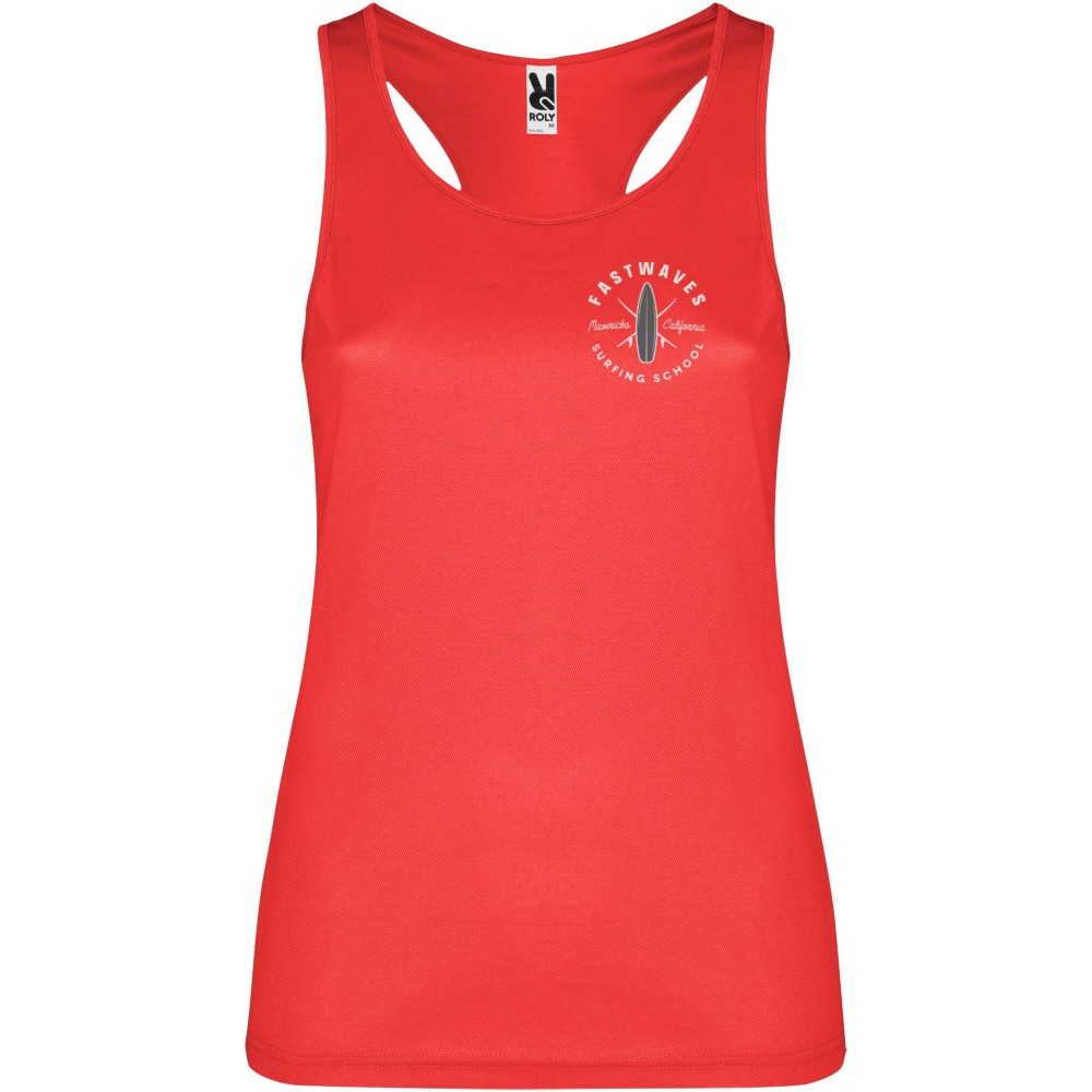 Technikai, légáteresztő, könnyen mosható és gyorsan száradó anyag. Bordázott karkivágások és nyakrész. Racerback kialakítás és oldalvarrások. Eltávolítható címke. 100% Polyester, 140 g/m2. Emblémázás: Szitanyomás