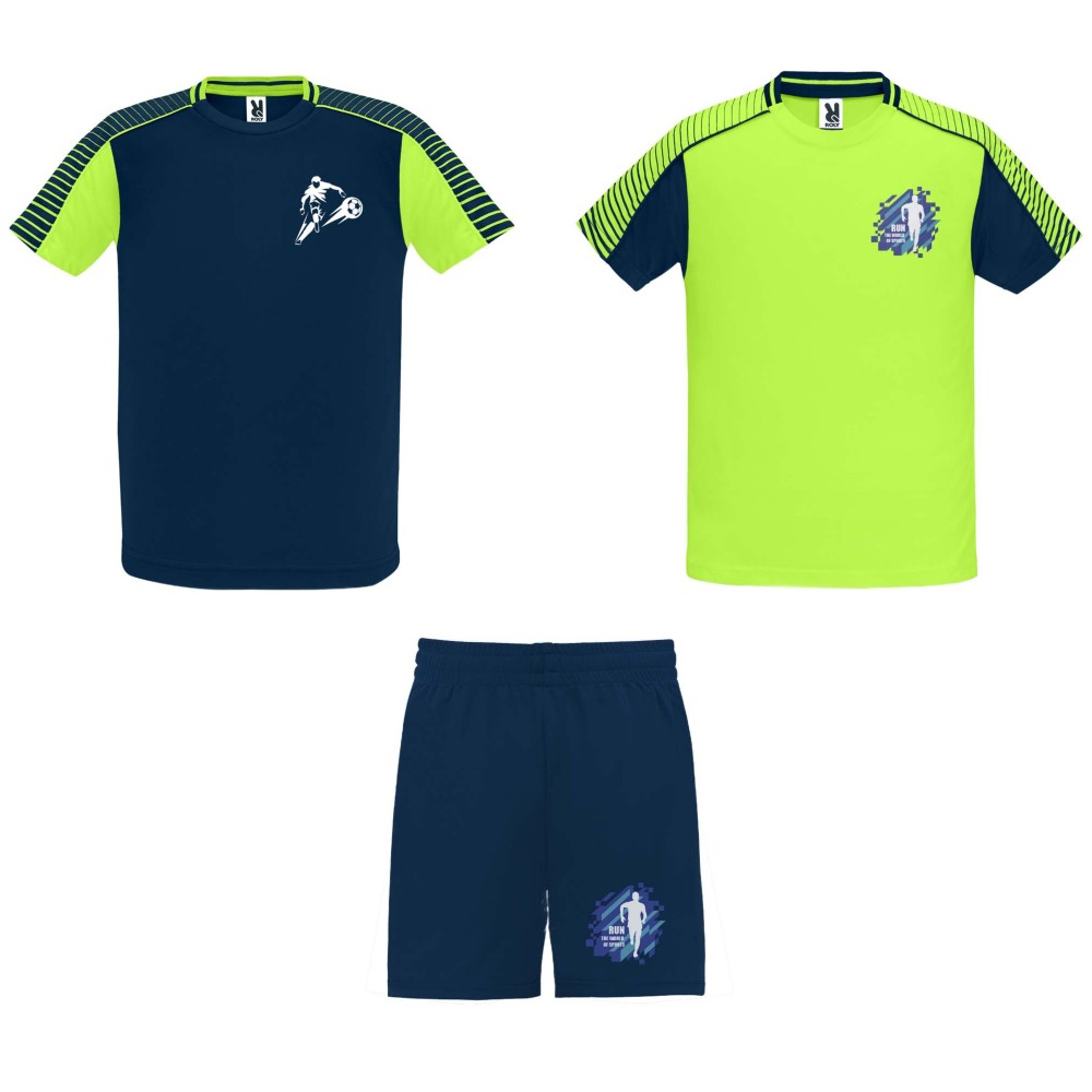 A szett 2 pólóból és 1 rövidnadrágból áll. A pólók színe ellentétes. Technikai és légáteresztő anyag. Pólók fél-raglán ujjal, kerek nyakkal. Rövidnadrág gumis derékkal, azonos színű húzózsinórral és biztonsági varrással, kontrasztos oldalcsíkkal és oldalsliccel. Eltávolítható címke. Emblémázás: Szitanyomás