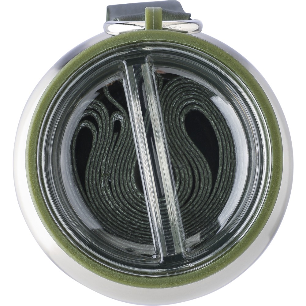 Duplafalú rozsdamentes acél kulacs, 500 ml-es. 304-es rozsdamentes acél belsővel és 201-es rozsdamentes acél külsővel. Átlátszó rekesszel ellátott PP csavaros kupakkal, cserélhető poliészter csuklópánttal, valamint egy 200 ml-es PP pohárral az alján. Ezüst színű felület matt részletekkel. Csomagolása barna papírdoboz. Emblémázás: Gravírozás