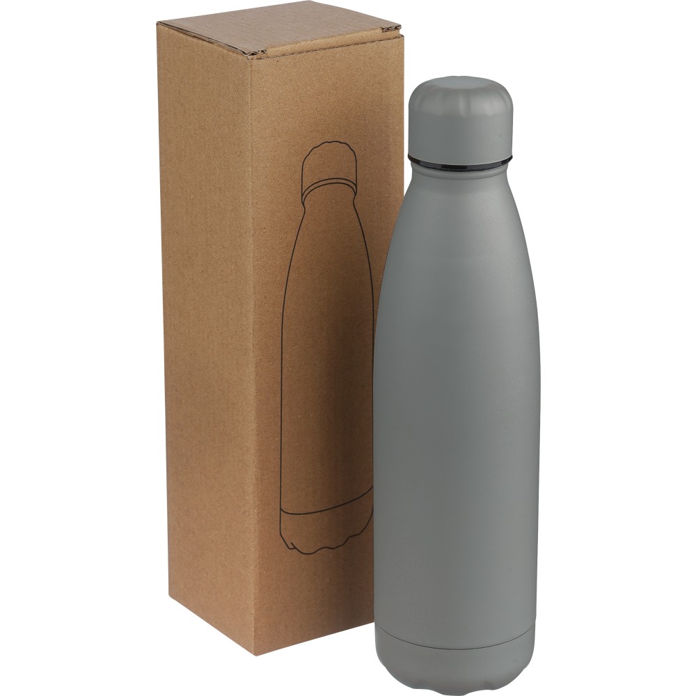 Újrahasznosított rozsdamentes acél ivópalack 500 ml-es űrtartalommal. Duplafalú szigetelés, amely akár 12 órán át melegen vagy hidegen tartja az italokat. A 304-es rozsdamentes acél belső kiváló tartósságot, rozsdaállóságot és biztonságos élelmiszer-érintkezést garantál. Selymes matt színű felülettel. A csavaros fedél és az aljzat színben egyezik a tiszta, egységes megjelenés érdekében. A palack elülső részén gravírozott újrahasznosított logó található. Egyenként, barna kartondobozba csomagolva.