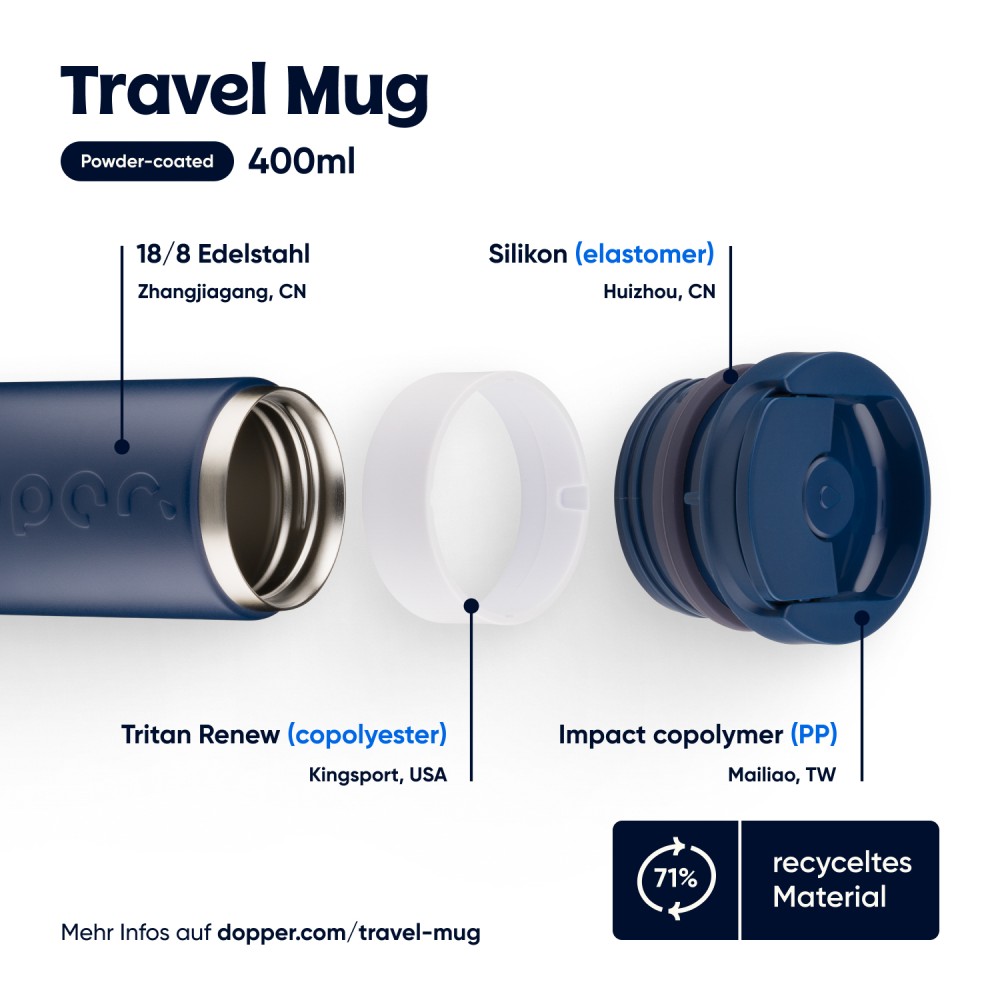 Reggeli koffeinlöket, napközbeni hidratálás vagy esti frissítő pezsgés ? ez a Dopper Travel Mug mindenre készen áll, bárhová is tartasz. Gőzölgően melegen tartja a forró italokat, hűvösen a hidegeket, és megőrzi a szénsavas italok buborékait is. Nincs szivárgás, nincs macera, nincs súlyfelesleg ? és határozottan nincs egyszer használatos hulladék. Könnyen nyitható, lepattintható kupakkal rendelkezik; az italokat akár 6 órán át melegen, 20 órán át pedig hidegen tartja. Duplafalú, 90%-ban újrahasznosított rozsdamentes acélból készült, tartós bevonattal ellátva. Mosogatógépben (emblémázás nélkül nélkül) 65 °C-ig mosható. Kávé vagy tea használata esetén elszíneződés vagy szagmaradvány előfordulhat. Forró folyadékok esetén fokozott óvatossággal használja!