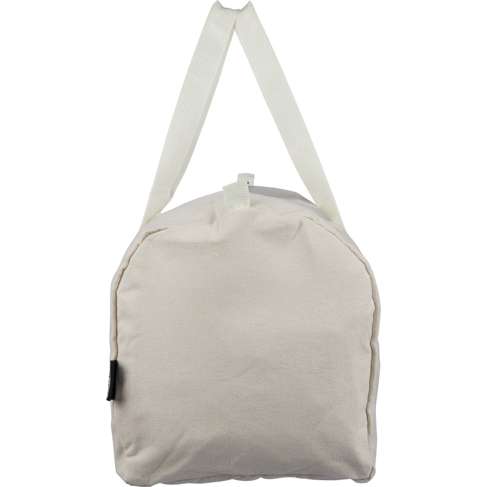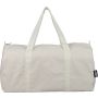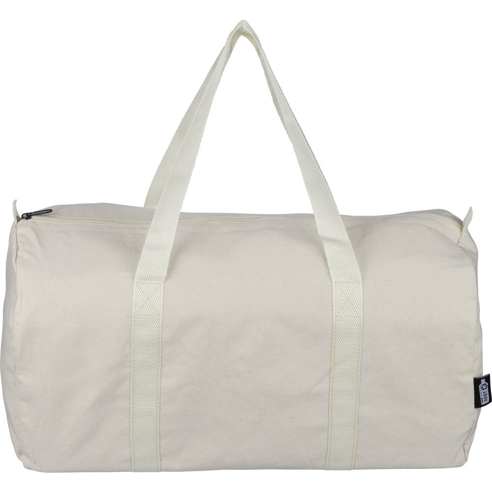 Újrahasznosított pamut-poliészter, 330 g/m2 kevertszövetből készült sporttáska nagy, cipzáras felső rekesszel, 100 cm hosszúságú és 3 cm szélességű hosszú fülekkel, a táska színével megegyező hevederrel. Megközelítőleg 30 literes űrtartalommal rendelkezik. A külső felületen rPET címkével, a belső részben újrahasznosított alapanyagra utaló címkével ellátva. Emblémázás: Szitanyomás