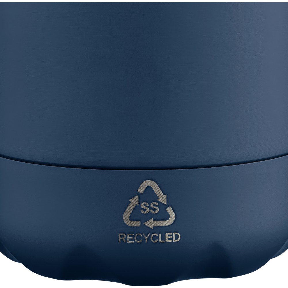 Újrahasznosított rozsdamentes acél, egyfalú ivópalack 700 ml-es űrtartalommal. Hideg italok tárolására alkalmas, és 3-4 órán át hűvösen tartja azokat. A 304-es rozsdamentes acél belső kiváló tartósságot, rozsdaállóságot és biztonságos élelmiszer-érintkezést garantál. Matt színű felülettel, valamint színben illeszkedő csavaros fedéllel és aljjal. Az elülső oldalon gravírozott újrahasznosított logó található. Egyenként barna kartondobozba csomagolva.